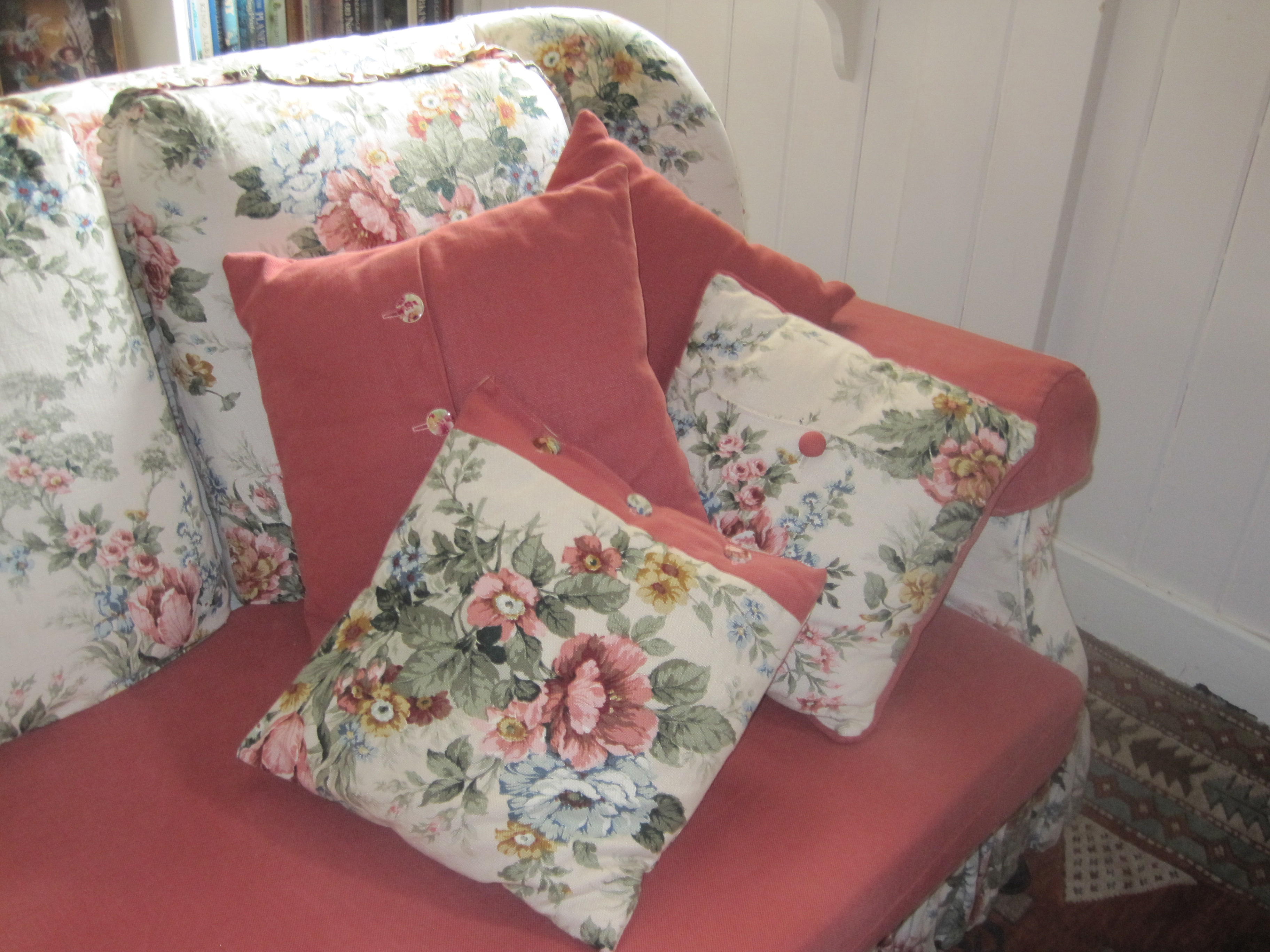 These cushions of varying design were made in a pretty floral linen and a soft new dusky pink fabric for a country cottage. Some of the buttons are made from the same vintage linen & some are lovely hand painted china. Continue scrolling down for more cushions…
