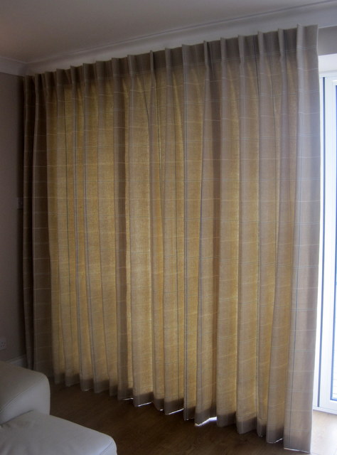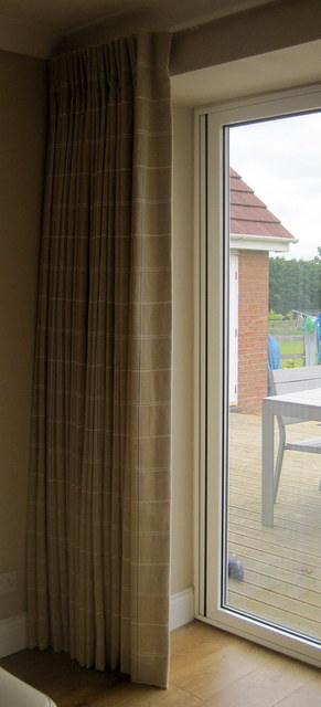 Lovely neat contemporary single pleat curtains on a 4m wide Silent Gliss track where minimal stack back is required for when the bi-fold doors are open. The track is perfect for this situation & the curtains glide easily along it with minimal effort.