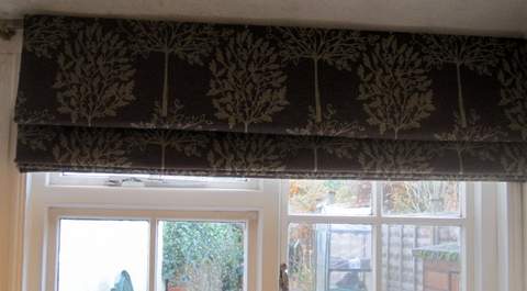 This roman blind is a cosy addition to an early 19c cottage kitchen. The interlined blind has thermal lining to improve the warmth of the room on chilly nights. Traditional fittings were used in this listed building; a fabric covered batten with brass cleat & acorn.