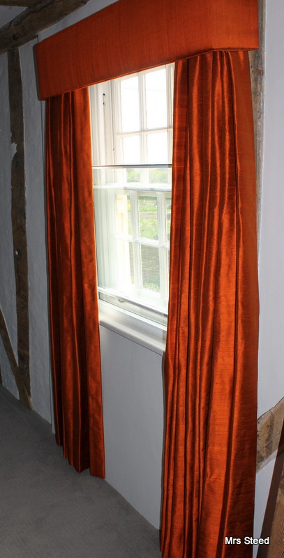 I used an interlining recommended especially for use with silk & a thermal lining with good drape qualities. The pelmets have a small piped edge for definition. The silk changes shade depending on the light due to the structure of the silk fibres which makes it difficult to capture & do justice to it’s beautiful ‘Ginger’ colour in photos.
