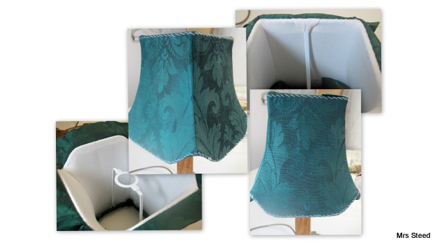 A lovely green silk damask was used to make a small table lamp shade with traditional silk lining….you can see the construction of the shade which is of course time consuming. The stitches on the shade will later be covered with a trim which could be made out of the same silk or a contrasting colour or braid…..what would you choose?