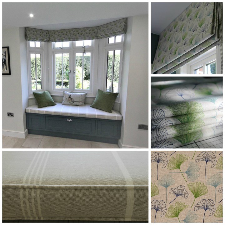 This stunning kitchen features bespoke roman blinds for the bay window & a side window which we made up in ‘Gingko’ linen, created by British designer Jessica Hayman of Rosa and Clara. The linen was printed in Lancashire & a pleasure to work with. We made the large, shaped window seat in Susie Watson striped heavy cotton fabric. Our client chose Zoffany Prussian & Dove designer paint for the walls & kitchen which has oak dovetailed drawers. Gorgeous Mandarin Stone flooring runs throughout the kitchen & into the large light filled dining room over looking the garden.