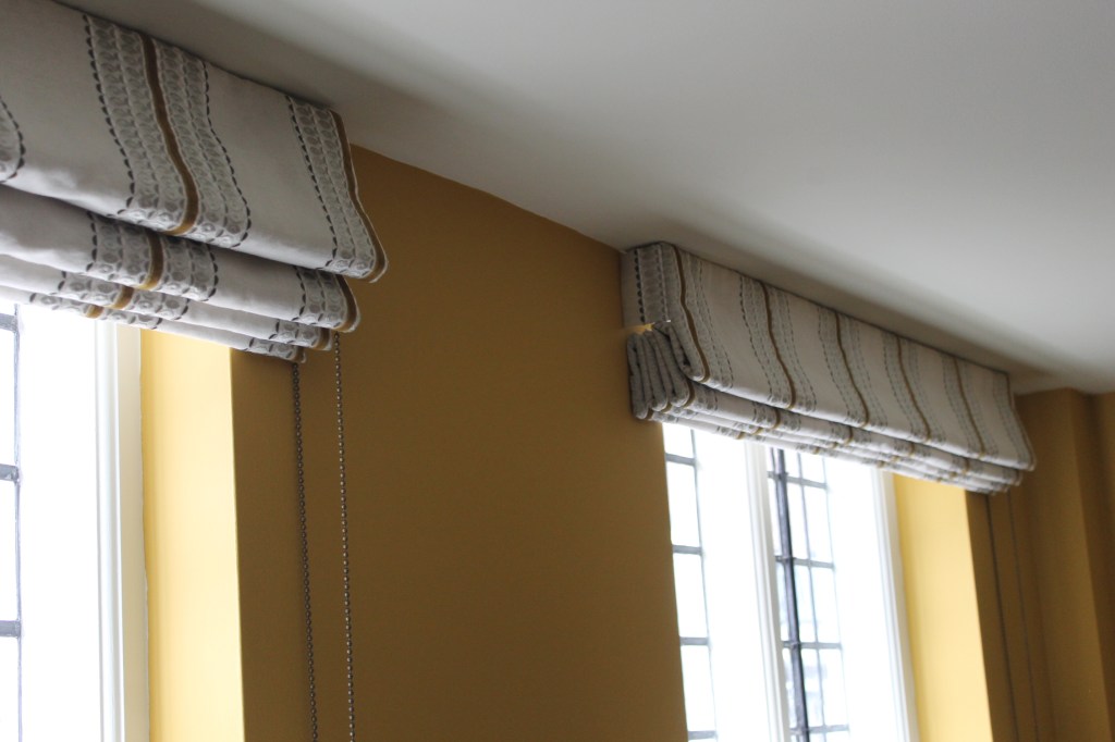 Interlined roman blinds in James Hare Ceylon stripe, Fenwick & Tilbrook paint ‘Chanterelle’ a lovely warm ochre colour