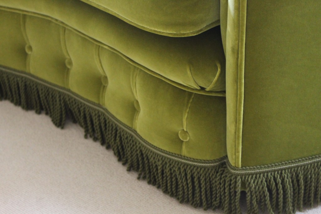 Our talented upholsterer also worked his magic on a fabulous, buttoned, kidney shape sofa. We used really beautiful green velvet from James Hare for this & added a deep bullion fringe from another one of our go to trimmings suppliers; Troynorth, who have a great selection of trimmings & braids.