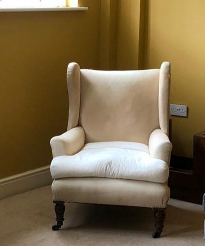 Another fabulous upholstery transformation is this lovely wing chair which was given a new lease of life in a soft ochre patterned fabric from Clarke & Clarke
