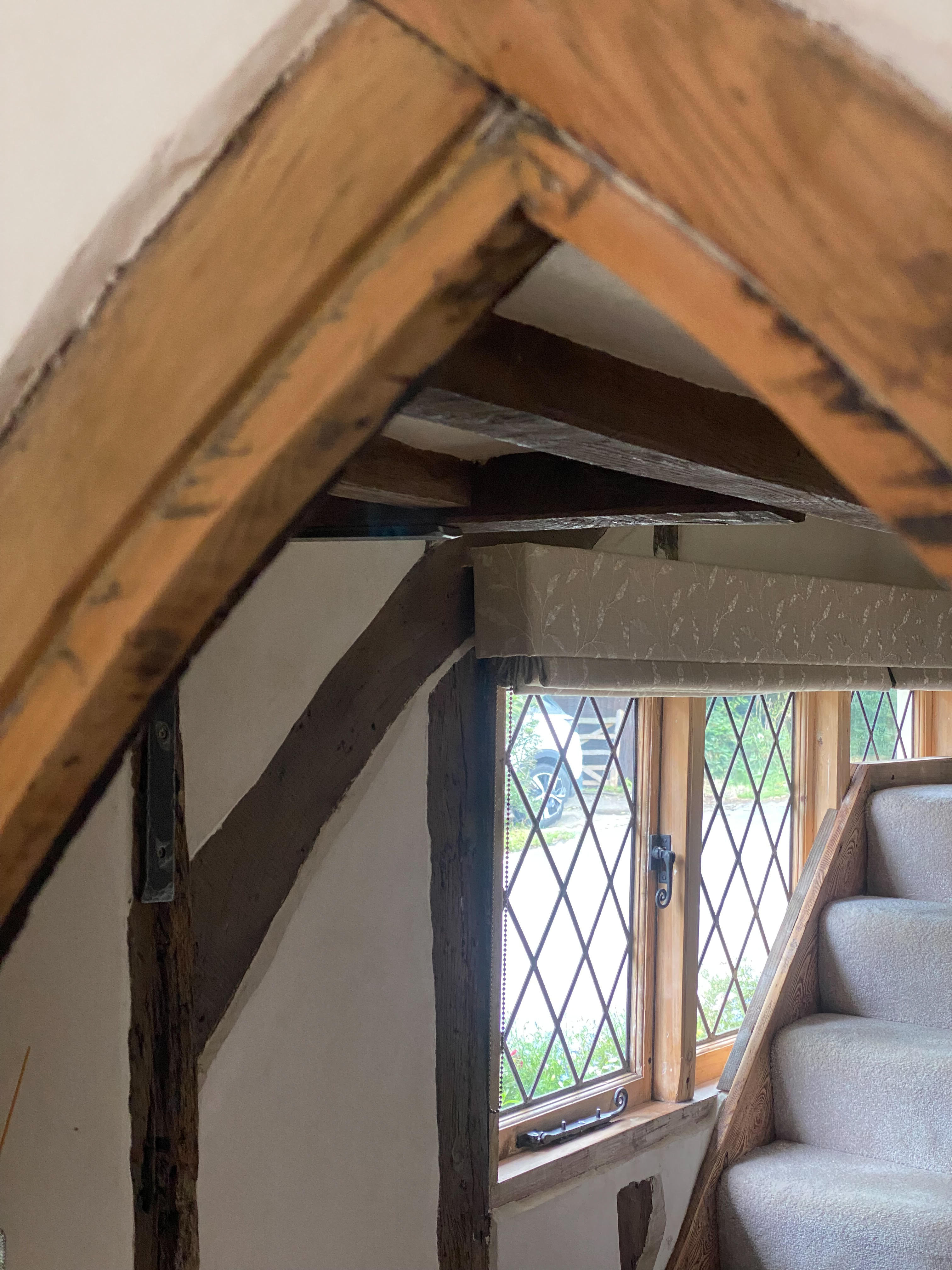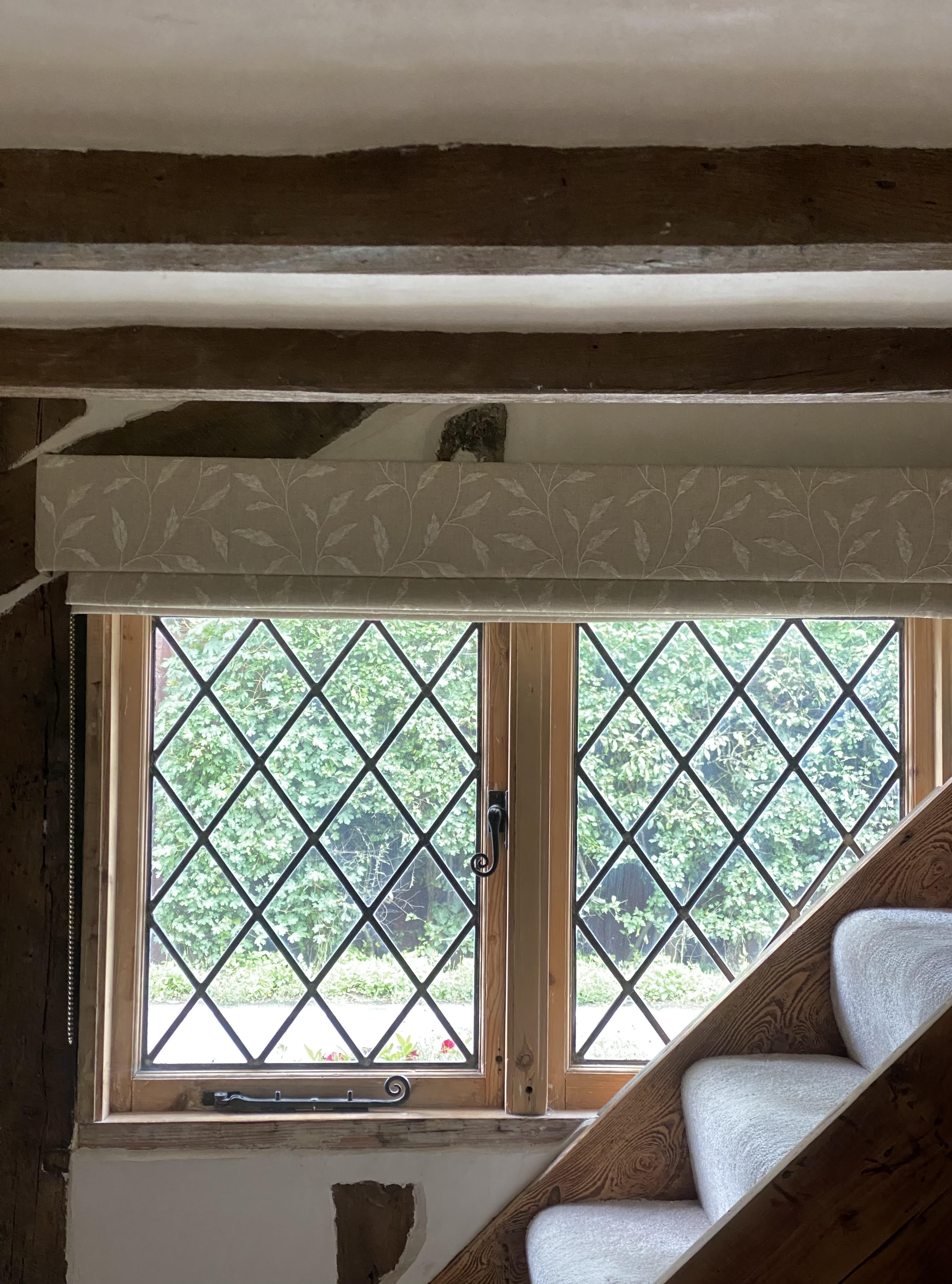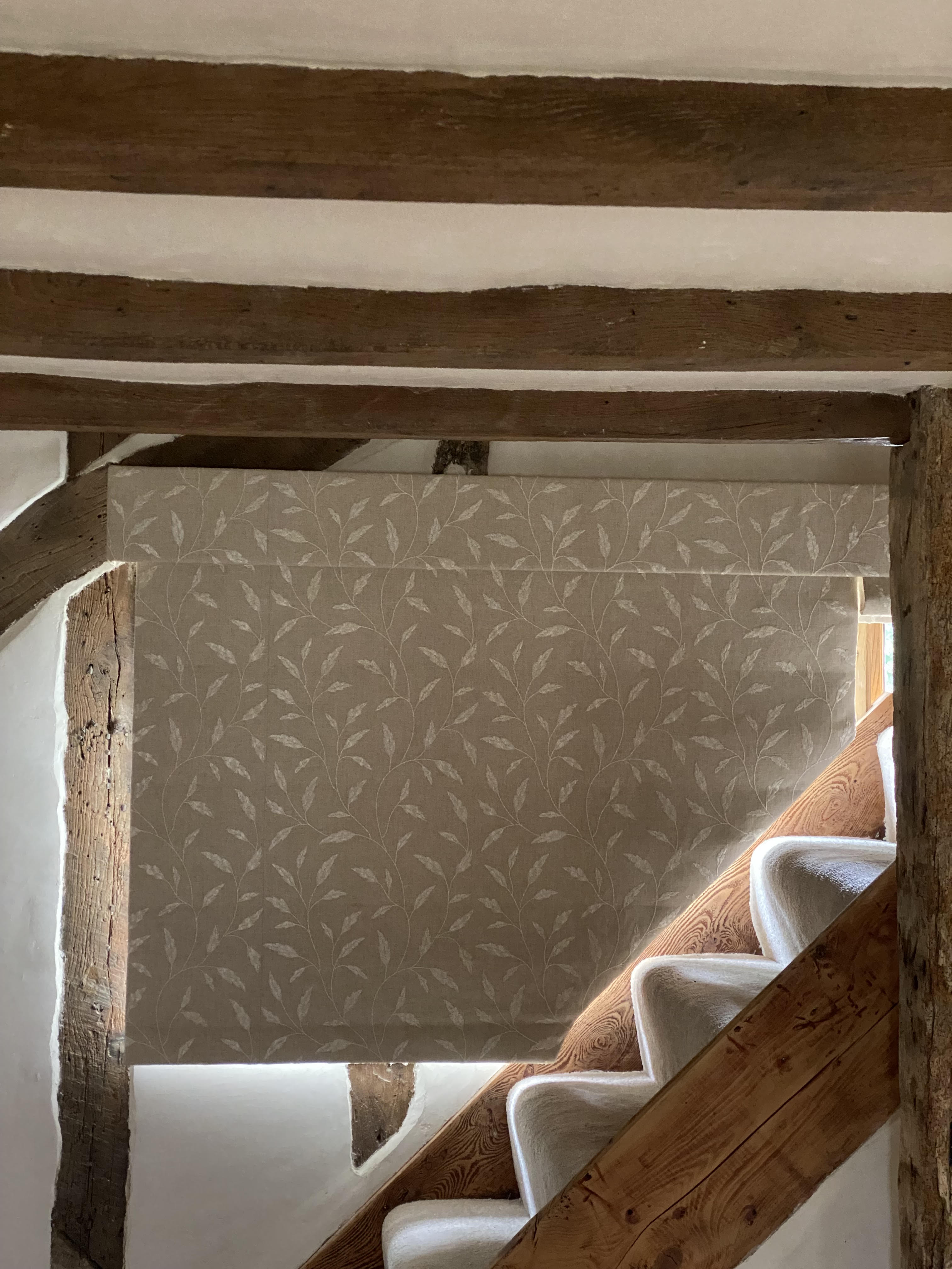 Working in a period cottage with somewhat wonky walls always poses a challenge but the home owners were determined to make their chosen style work & assisted by preparing the staircase window wall so that a long, narrow pelmet could be fitted above the windows. The top of the pelmet would be seen by anyone descending the stairs so that also had to be visually pleasing.