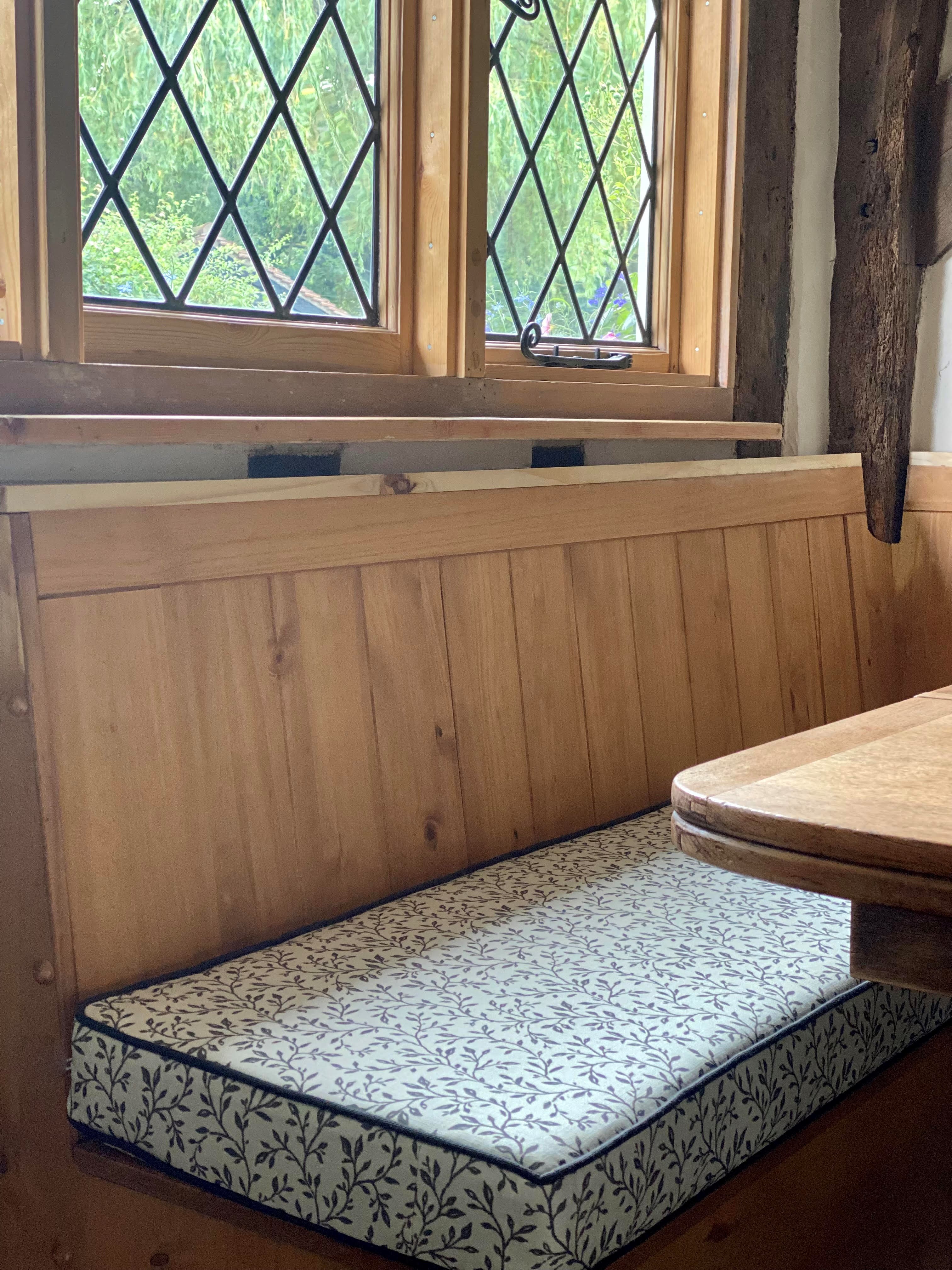 Roman blinds pattern matched to the pelmets & comfortable seat cushions were made for the built in bench seats in the dining area & tiny entrance hall.